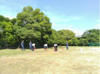 体育館からの火災を想定して、煙を避けられるよう校舎の北側中央からグランドへ避難し、点呼。災害時に協力して下校でき るよう地区別に整列しなおし、場合に応じて小学校児童を引率するなどの役割の意識付けも行いました。