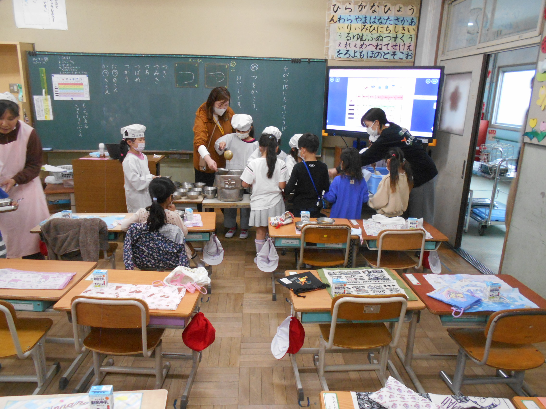 1年生にとっては何からなにまで初めての体験です。給食を取りに行くルートや取りに行く順番をしっかりと決めないとぶつかってこぼしたり、混雑しすぎてパニックなったりすることもあります。初日はとくに4時間目の1時間を使って進め方を指導します。そのおかげで初日も二日目も大きな事故もなく無事に食べることができました。