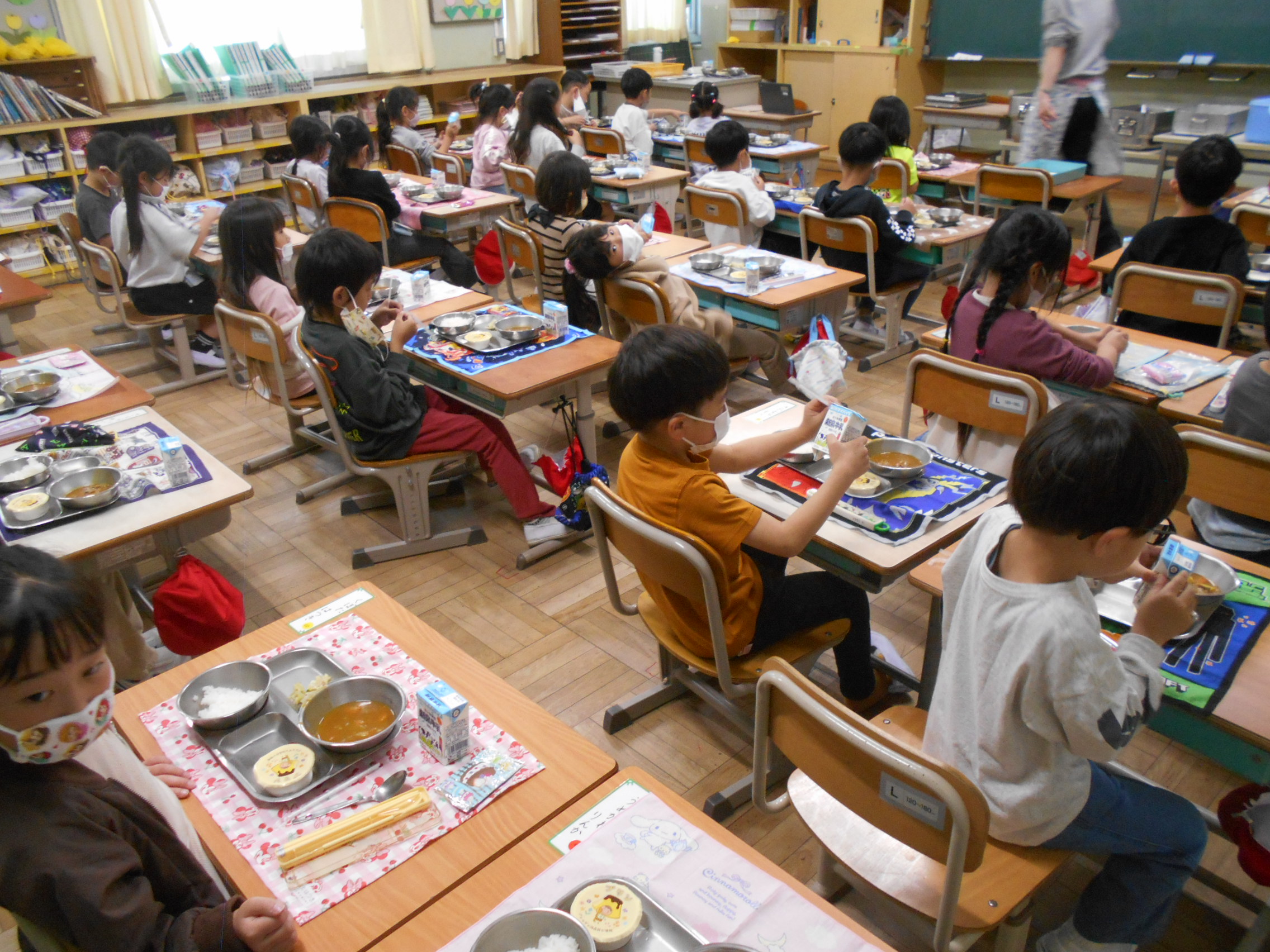 4月15日(水)は1年生にとってはじめての給食がありました。一番の人気メニューのカレーで多くの子どもがおいしく食べることができました。給食はアレルギーなど事故の危険もありますので少し気を使いながら給食指導をすることになります。