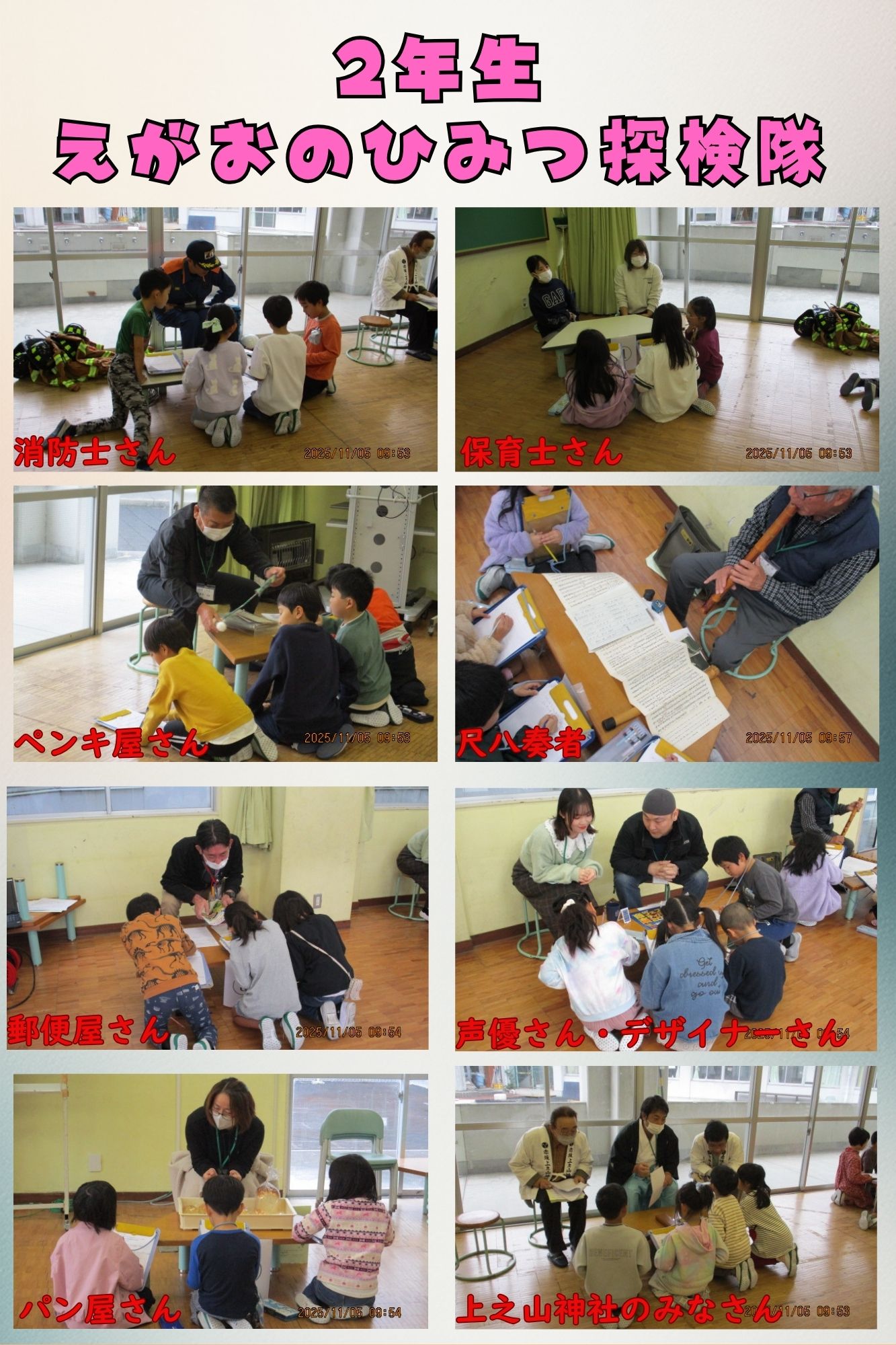 来てくださったのは、神社の宮司さん、ペンキ屋さん、警察官、郵便局員、そろばん塾の先生、パン屋さん、デザイナーさん、声優さん、保育士さん、尺八奏者さん、消防士さんです。