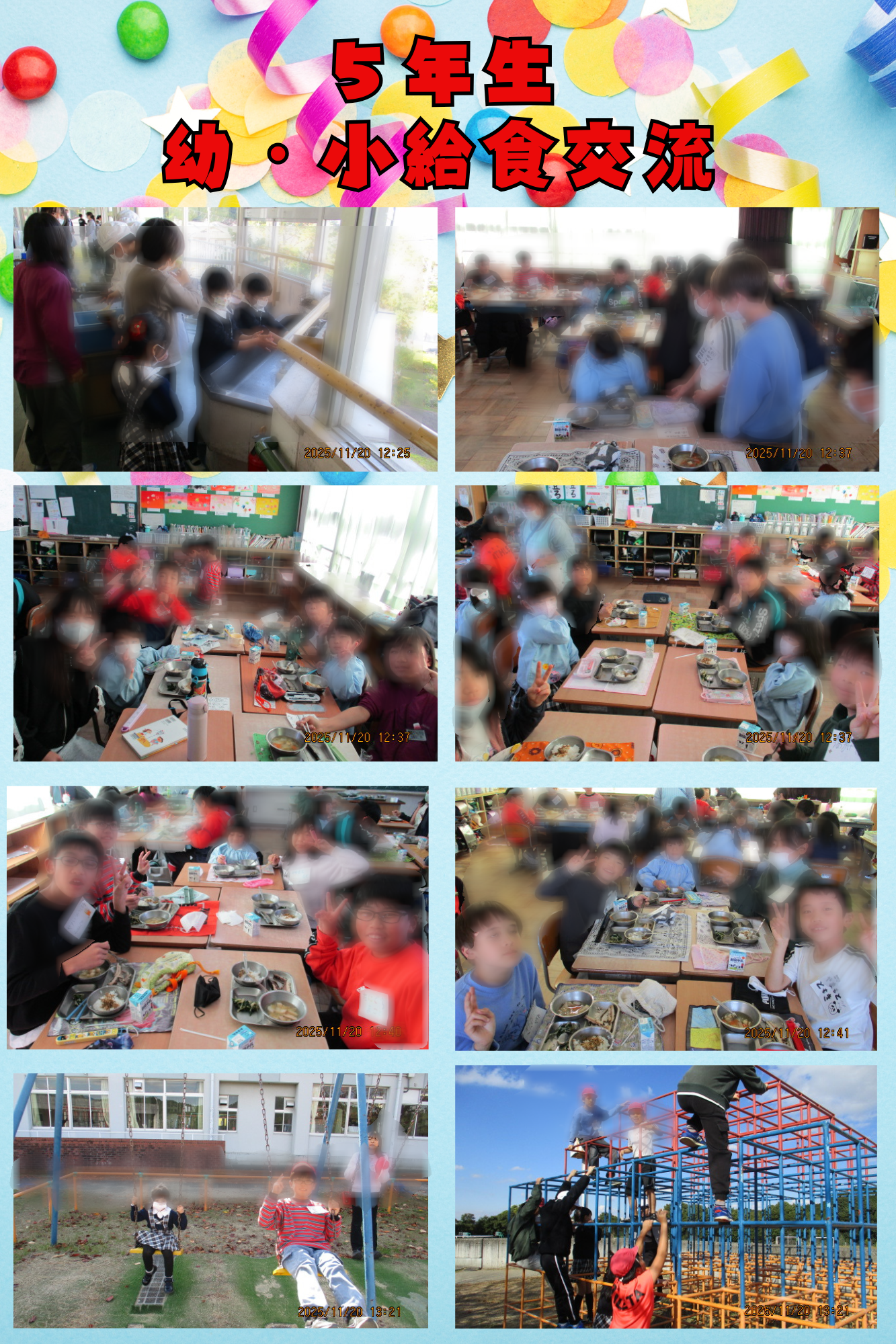 5年生が、エピーク幼稚園の年長組さんとの交流を行いました。今回は幼稚園の子どもたちが本校に来てくれ、一緒に給食を食べたり、お昼休みに遊具で遊んだりと、楽しい時間を過ごしました。